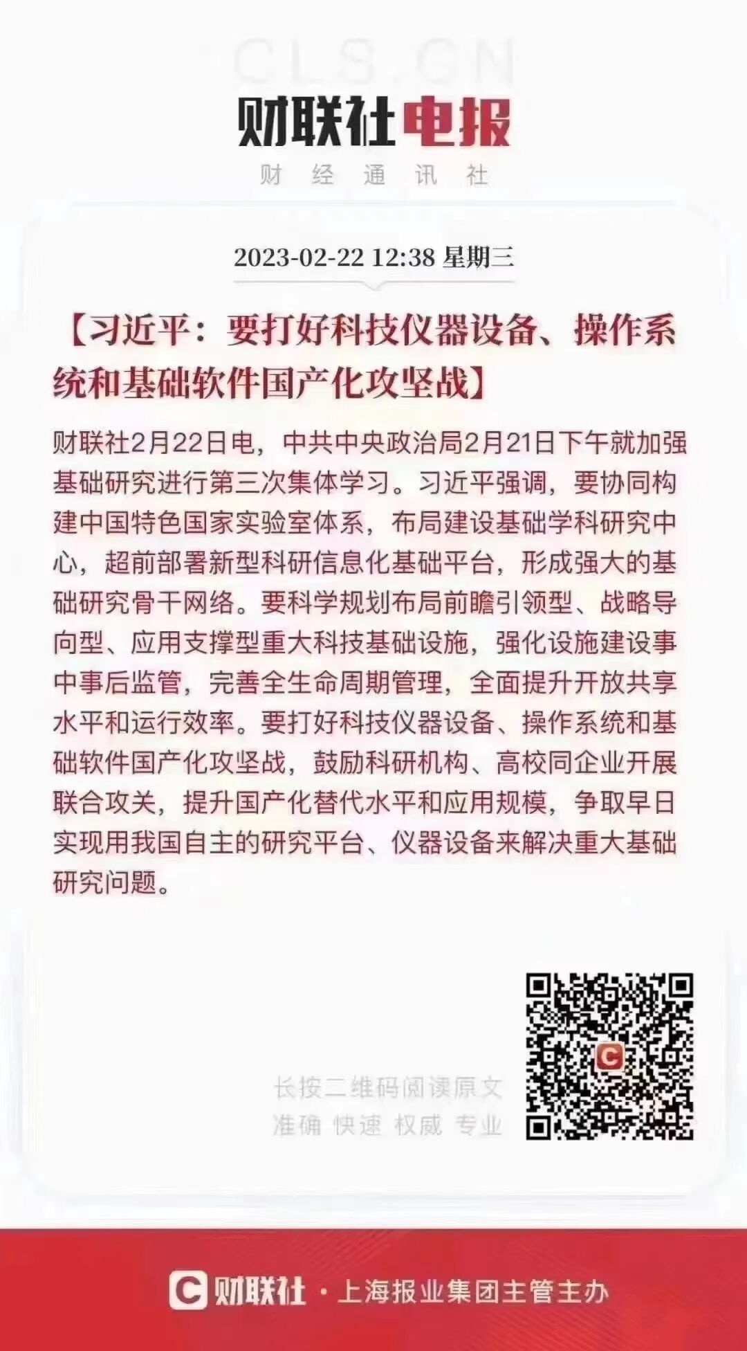中共中央政治局2月21日下午就加強基礎研究進行第三次集體學習。中共中央總書記習近平強調,要協同構建中國特色國家實驗室體系,布局建設基礎學科研究中心,超前部署新型科研信息化基礎平臺,形成強大的基礎研究骨干網絡。要科學規劃布局前瞻引領型、戰略導向型、應用支撐型重大科技基礎設施,強化設施建設事中事后監管,完善全生命周期管理,全面提升開放共享水平和運行效率。要打好科技儀器設備、操作系統和基礎軟件國產化攻堅戰,鼓勵科研機構、高校同企業開展聯合攻關,提升國產化替代水平和應用規模,爭取早日實現用我國自主的研究平臺、儀器設備來解決重大基礎研究問題。