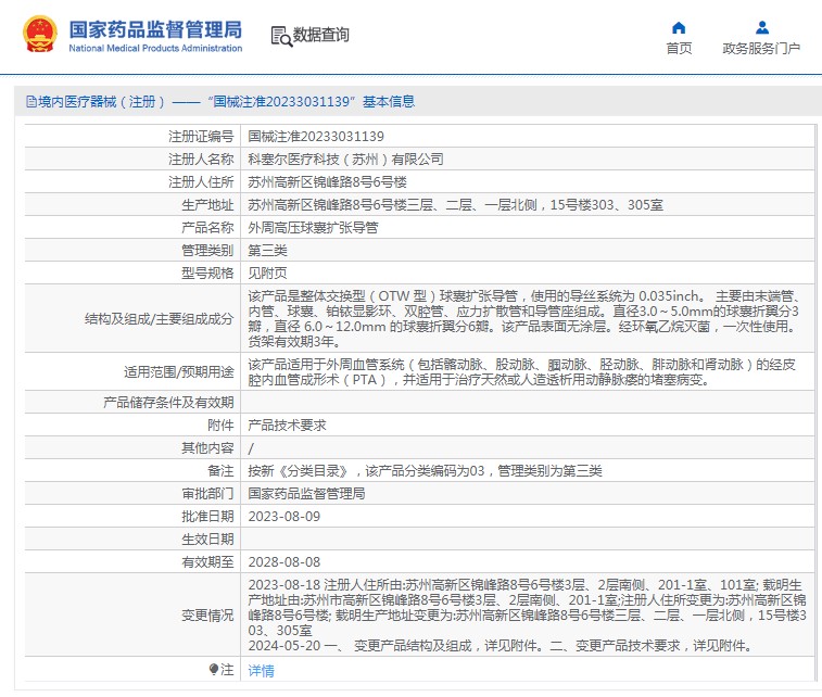 該產品適用于外周血管系統(包括髂動脈、股動脈、腘動脈、脛動脈、腓動脈和腎動脈)的經皮腔內血管成形術(PTA),并適用于治療天然或人造透析用動靜脈瘺的堵塞病變。