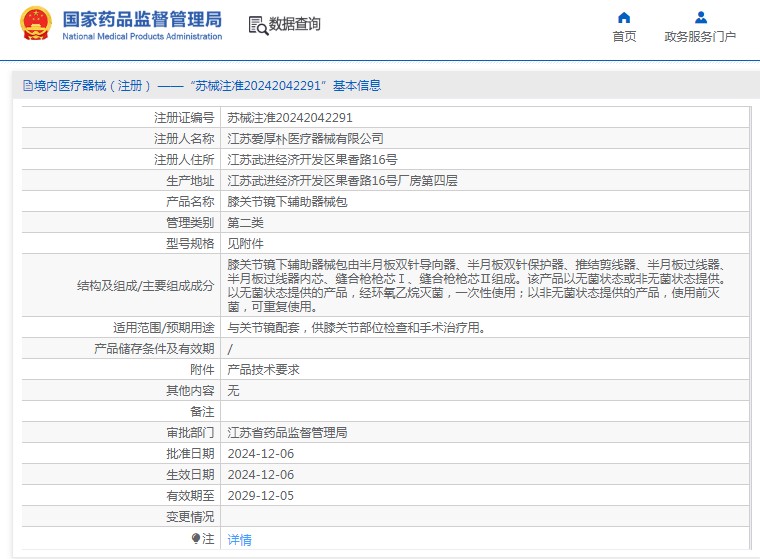 膝關(guān)節(jié)鏡下輔助器械包由半月板雙針導(dǎo)向器、半月板雙針保護器、推結(jié)剪線器、半月板過線器、半月板過線器內(nèi)芯、縫合槍槍芯Ⅰ、縫合槍槍芯Ⅱ組成。該產(chǎn)品以無菌狀態(tài)或非無菌狀態(tài)提供。以無菌狀態(tài)提供的產(chǎn)品,經(jīng)環(huán)氧乙烷滅菌,***次性使用;以非無菌狀態(tài)提供的產(chǎn)品,使用前滅菌,可重復(fù)使用。